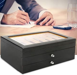 TELAM Boîte de présentation de stylo à 34 emplacements Coffret en bois, grande capacité avec dessus en verre Plateau à stylo de présentation en bois peint, présentoir à trois niveaux avec tiroir