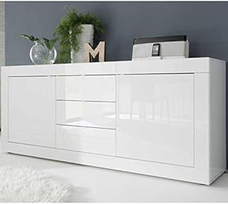 Tousmesmeubles Buffet 2 Portes 3 tiroirs Blanc laqué Brillant - Matera - L 207 x l 43 x H 86 - Neuf