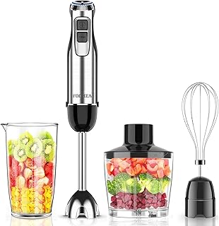 Mixeur Plongeant, FOCHEA 800W 4 en 1 Mixeur à Main Multifonction avec 6 Vitesses de Réglables et Turbo, Fouet et Hachoir, Tasse à Mesurer 600ML, Hachoir 500ML, sans BPA