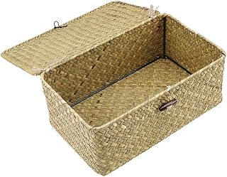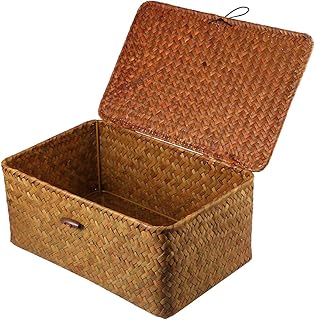 Vosarea Panier de rangement en rotin, 27,9 cm, panier en paille d'algues, panier de rangement tressé à la main, récipient multifonction avec couvercle pour décoration de bureau, maison Taille L