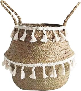 Lizefang Panier De Rangement - Panier Tissé en Rotin, Blanc Tassel Macrame Panier De Rangement des Ménages Pliable Seagrass Rack Tissé Jardin Fleur Vase Suspendus Titulaire