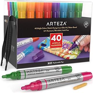 Marqueurs Arteza à peinture acrylique, set de 40 stylos couleur assortis, pointes remplaçables, pour roches, toile, verre, bois et plastique